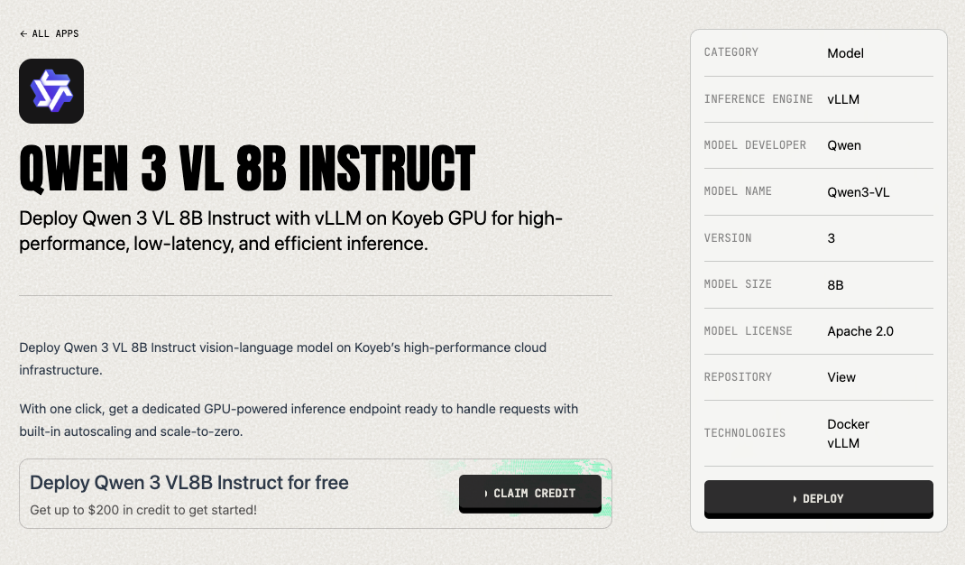 Koyeb supports two new one-click deploy options: Qwen 3 VL 8b Instruct and n8n. Qwen 3 VL 8b Instruct is a lightweight version of Qwen’s most powerful vision-language model to-date. You can deploy Qwen 3 VL 8b Instuct on Koyeb with one click and try out its capabilities served through vLLM. n8n is a secure workflow automation tool for technical teams, and with Koyeb’s one-click deploy of n8n, you can start building workflows in a user-friendly UI in minutes.